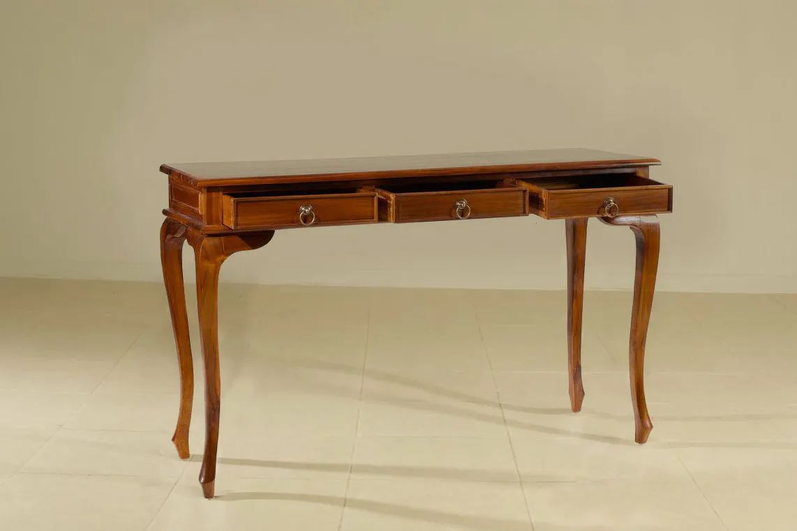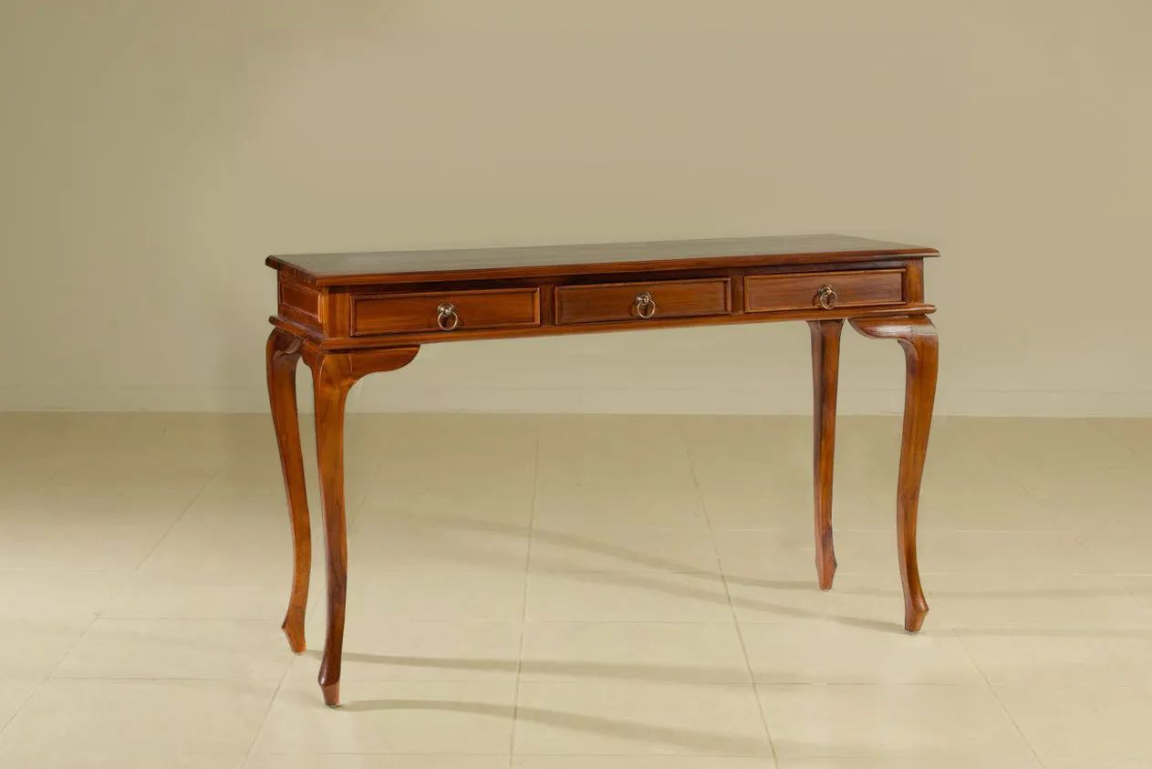 Cabriole legs Betawi console table handmade of teak wood. Solid wood top, dovetailed joints 3 drawers, solid brass ring plate pulls.