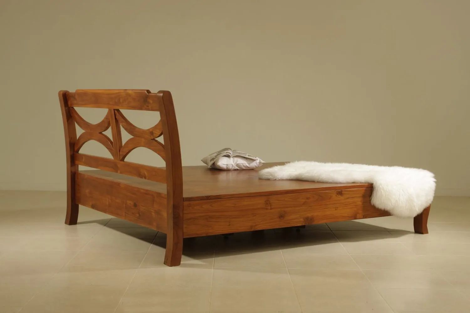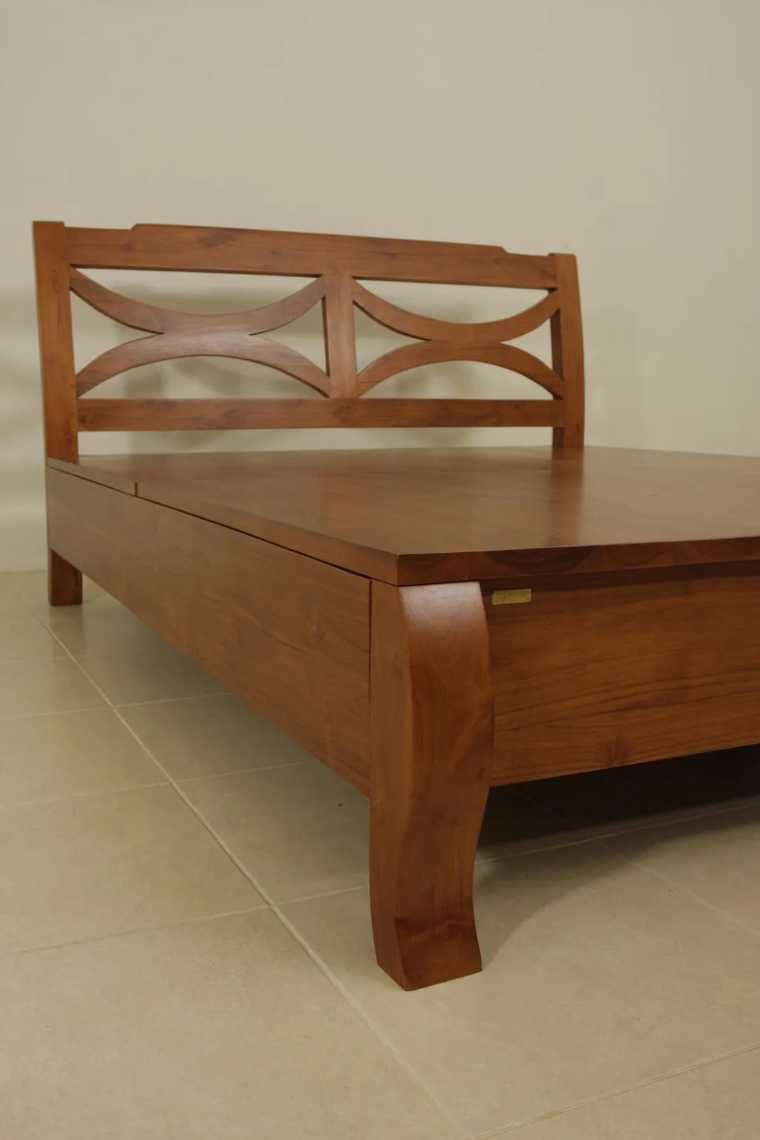 We use several grits of sandpaper to clean and smooth the teak wood surface of the bed. Sealed with lacquer to protect the wood pores. Stained with natural color and apply polyurethane spray coating to the piece.