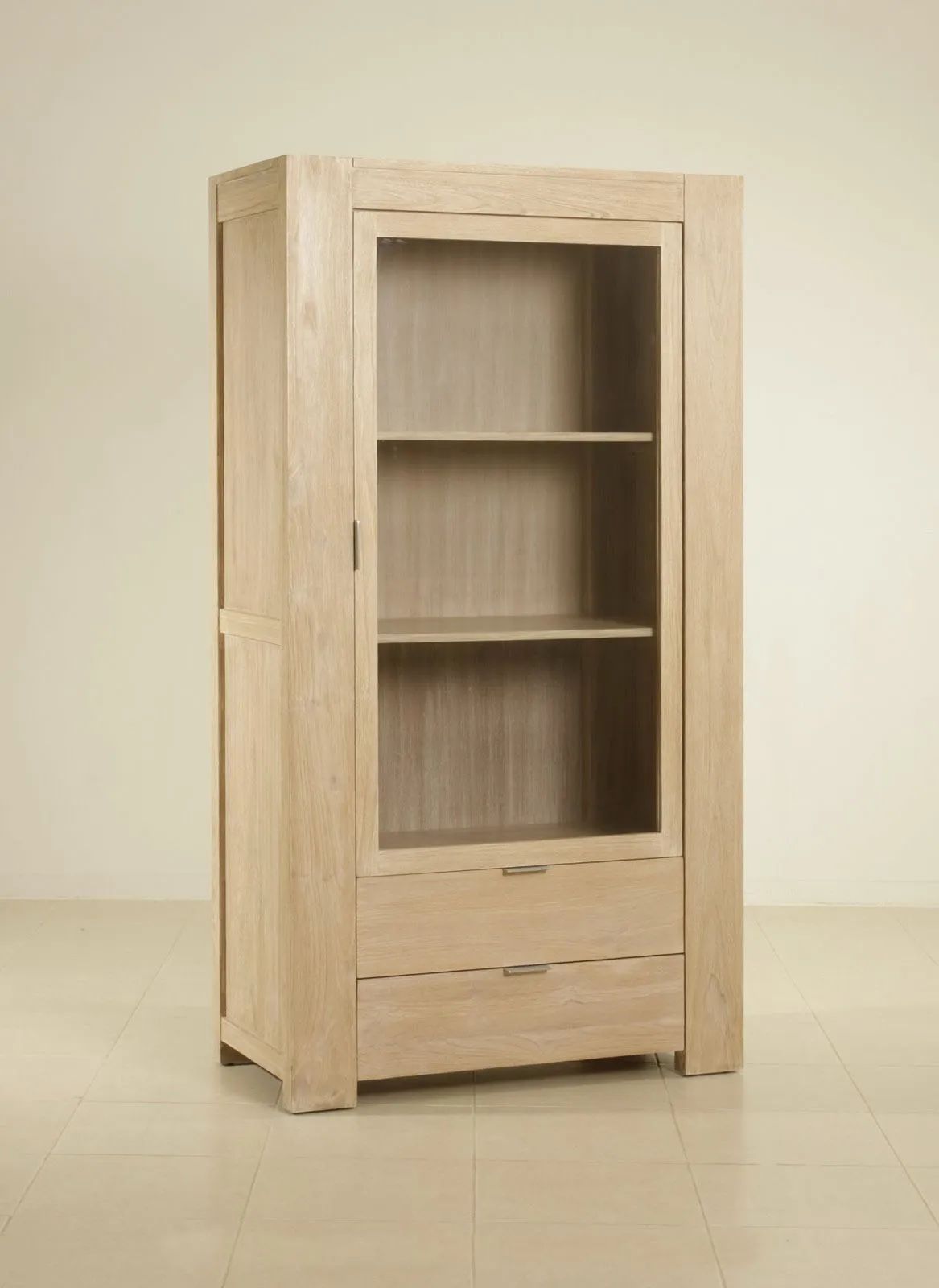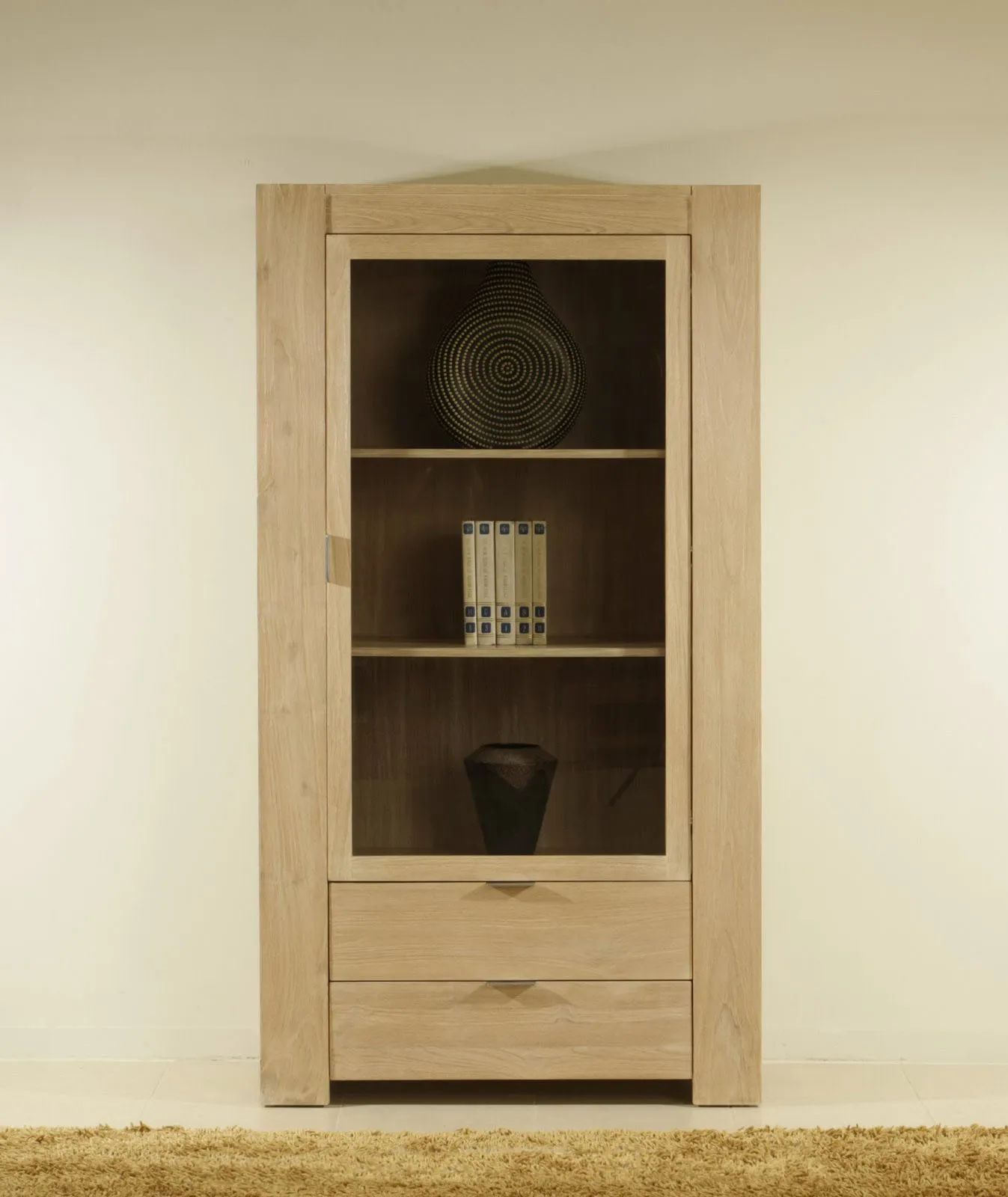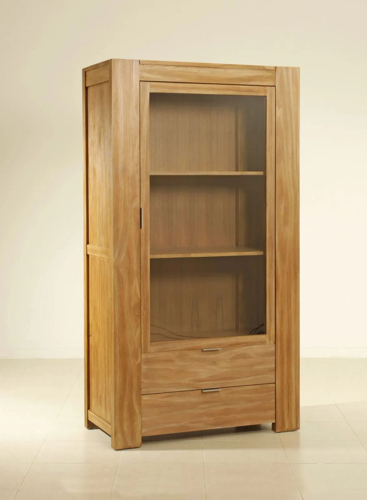 A modern display cabinet handmade of teak wood. 2 drawers bottom, glass door and 2 adjustable shelves top.