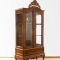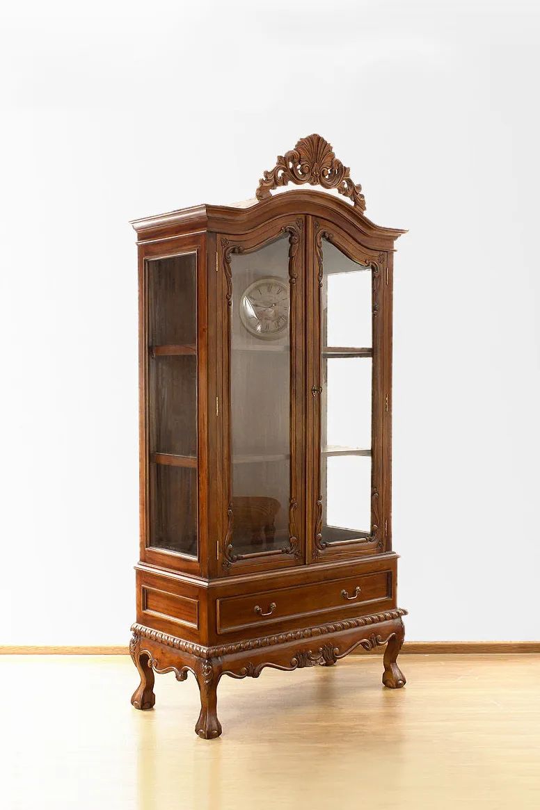 Crowned with elaborate wood carving, the Chippendale vitrine will furnishing your dining room as a china cabinet, or as display cabinet in your living room, in classic style. The piece comes with glass side compartment enclosed by 2 glass doors and wooden drawer.
