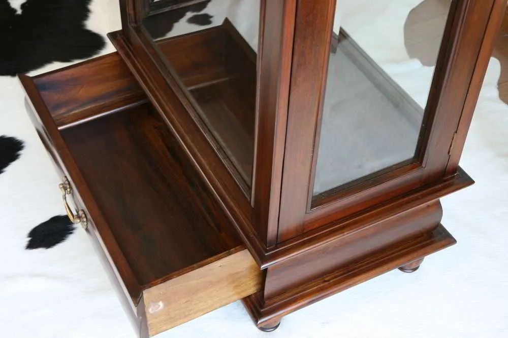 A slim vitrine colonial period antique furniture reproduction handcrafted of mahogany solid wood. All four sides enclosed by glass framed with plain solid wood. Curves front drawers and four bun feet base.
