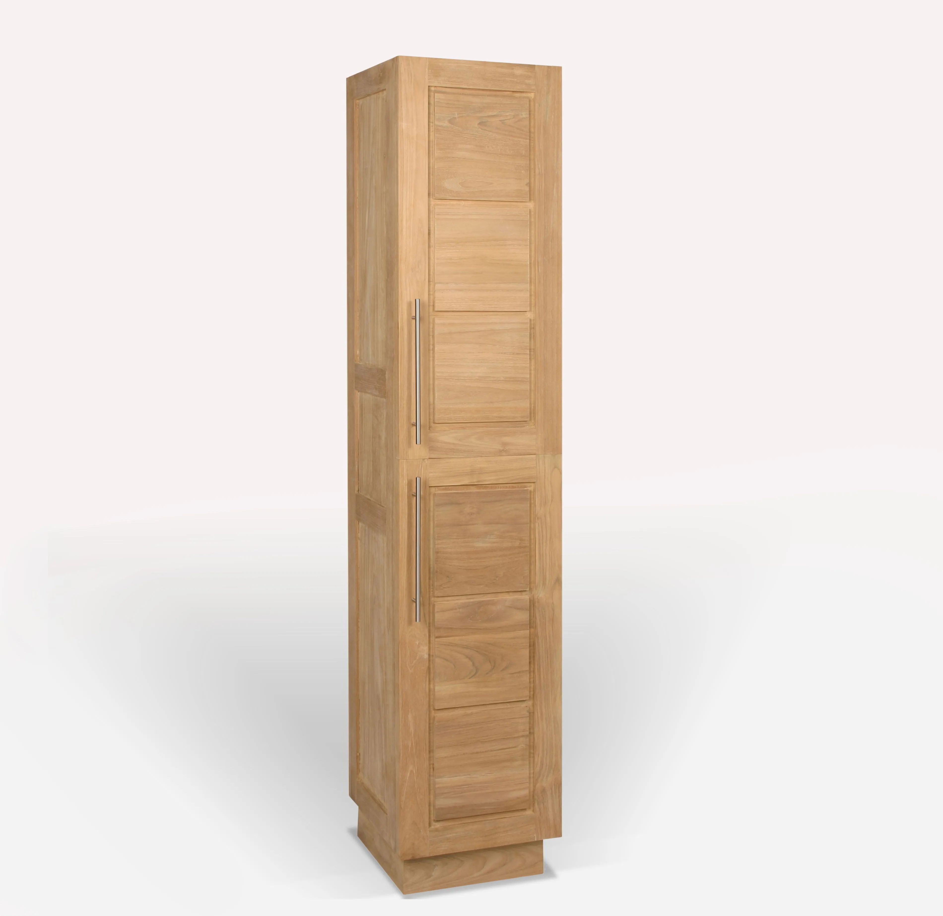 The teak bathroom closet PD is combined slim shape with the sturdiness of teak solid wood. High and slim furniture storage that will perfectly fit a small bathroom. The closet features a compartment and concealed drawers enclosed by 2 doors.