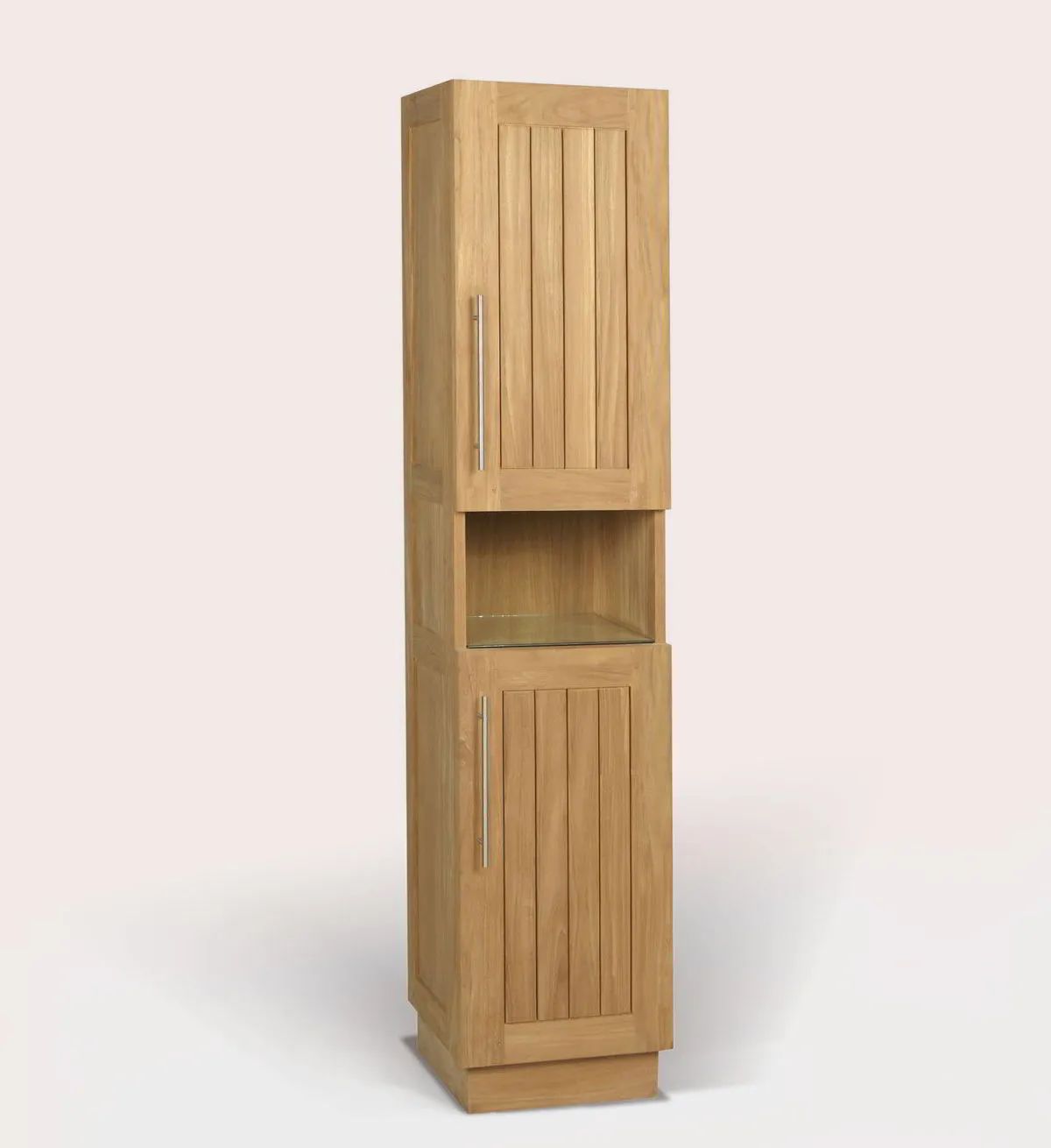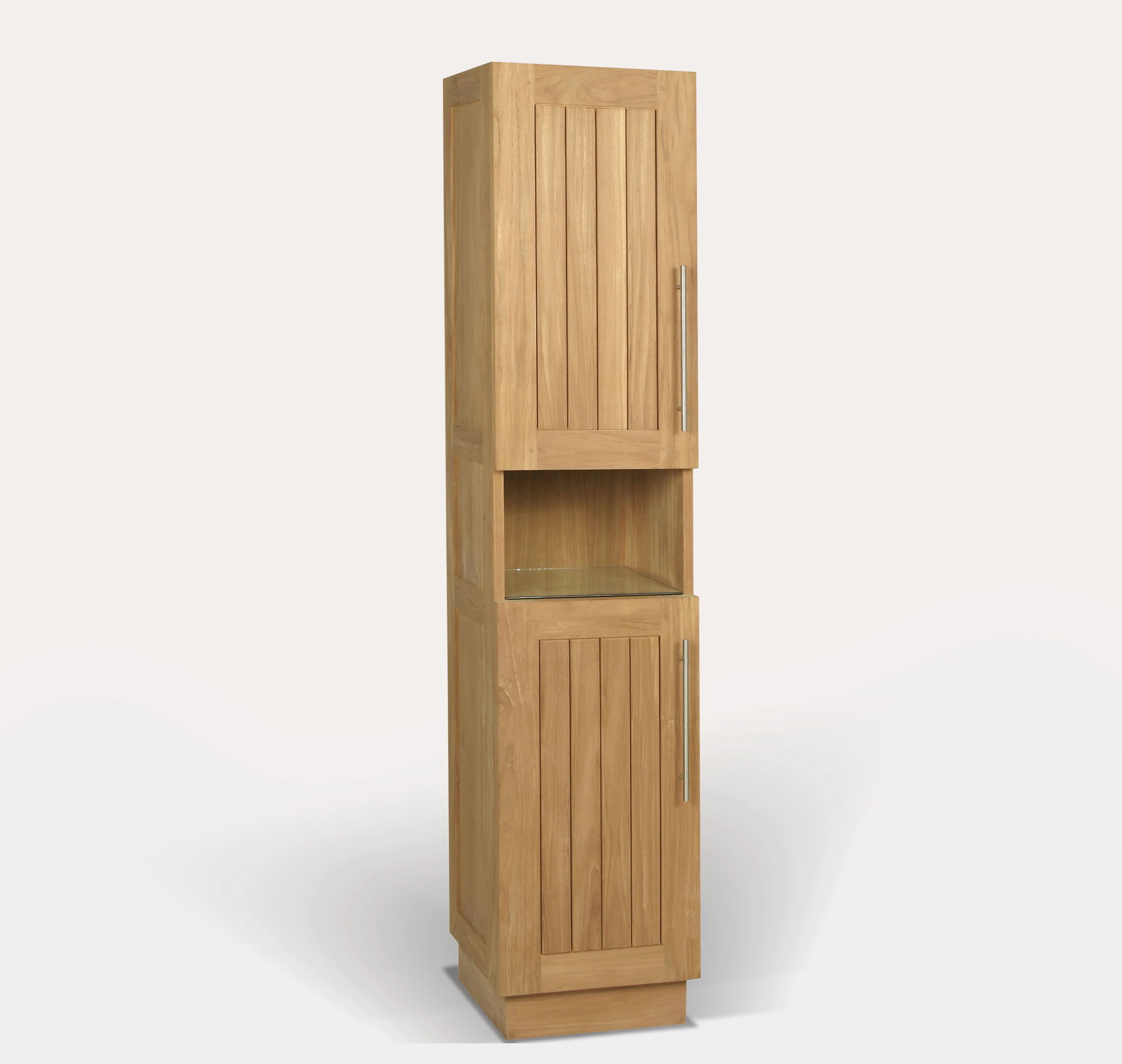 Bathroom closet open glass shelf middle, 2 doors right hinges. Made of teak wood, stainless steel door hinges and handle, drawers rails and pulls. Each door cover a removable shelf inside.