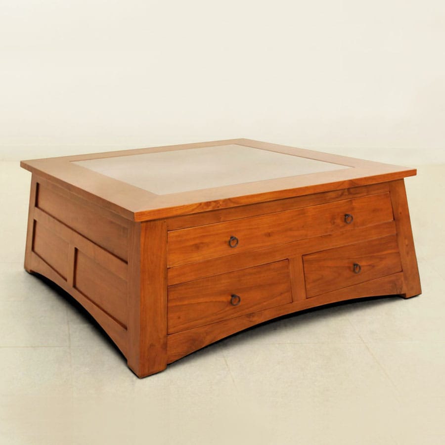 A simple but beautiful square coffee table handcrafted out of teak wood harvested from sustainable plantation. Solid wood plain frame inserted with plywood panel top leaf fitted onto sturdy saber four legs.