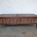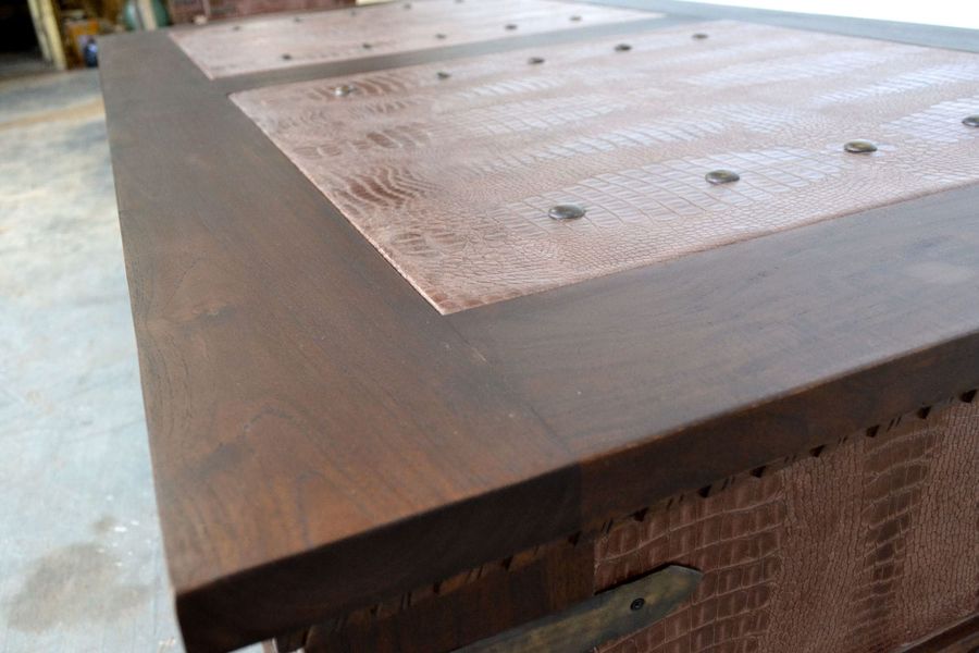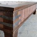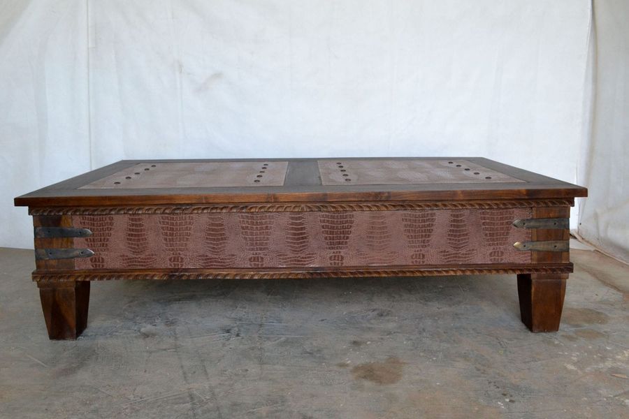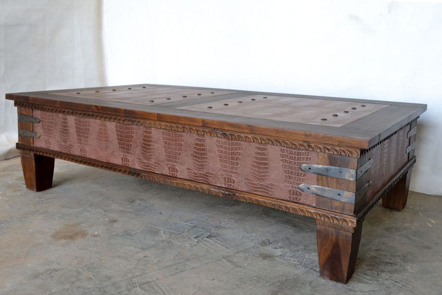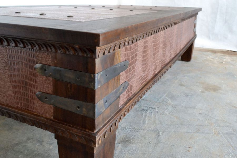 Strong and bold solid wood inlaid with leather fastened with antique brass nails. This coffee table will be a perfect centerpiece in your living room. The piece is made of teak wood, employs brass accented four large tapered legs.