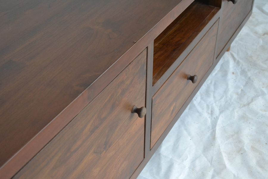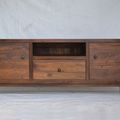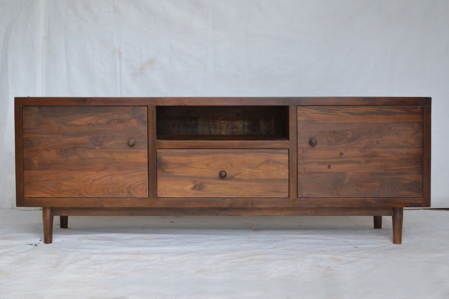 Mid century style Mangus tv cabinet hand made of reclaimed teak wood from Javanese old traditional house. Solid wood top leaf in 4 cm thick assembled with loose tongue joint. 2 doors front left and right, open shelf and a drawer center.