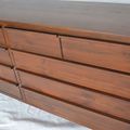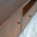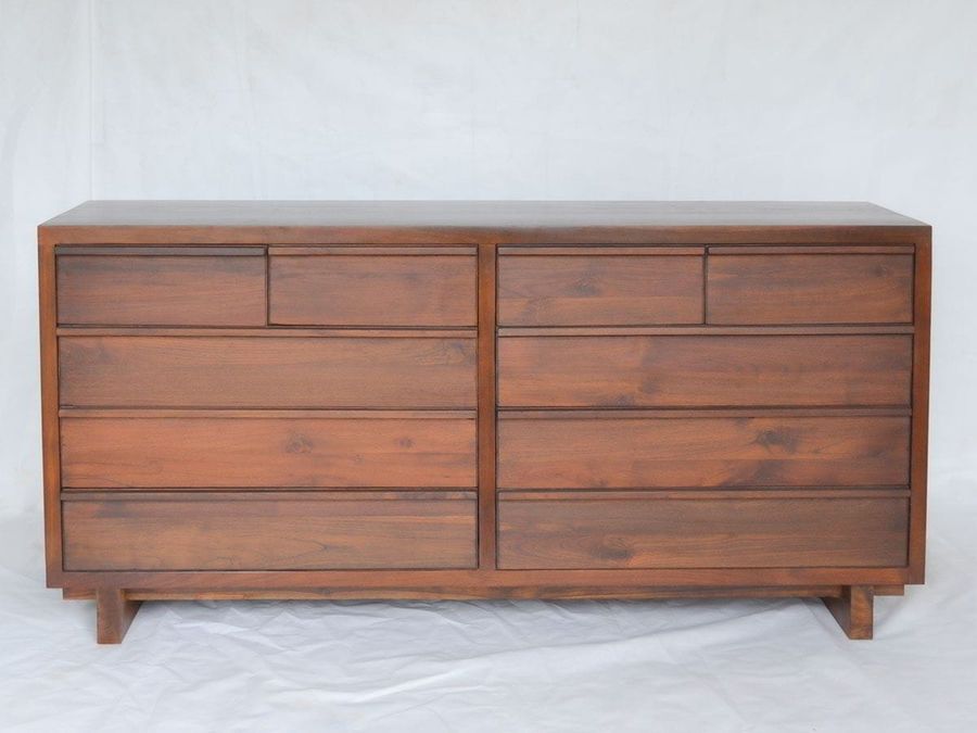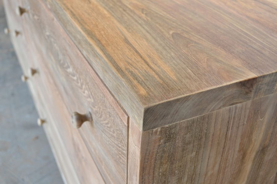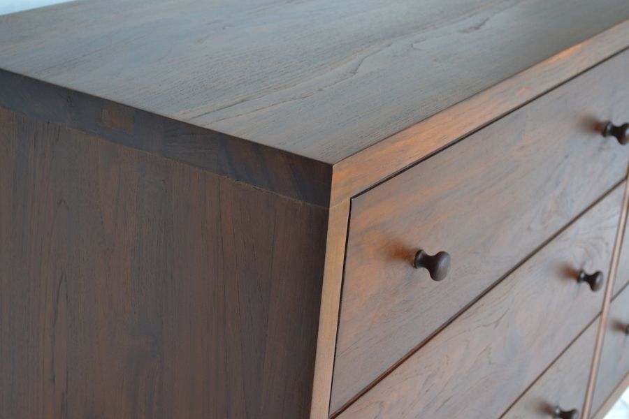 The Mokus dresser is hand-crafted out of reclaimed teak wood from an abandoned traditional house in Java. The wardrobe has 6 large drawers in 3 rows and 4 small drawers in a row. The first row consists of 4 small drawers, and the other 3 rows consist of 2 large drawers. The drawers use tandem steel rails for easy pulling and pushing. The upper side of the front of the drawer protrudes forward to function as a pull.