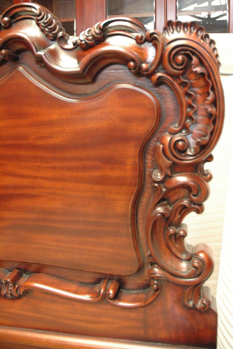 The beautiful mahogany bed frame is crafted to imitate a classic rococo period bed. This bed is made based on photos sent by a private customer. Several modifications were made according to the wishes of the customer while maintaining the aesthetics of the design.