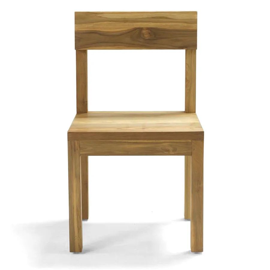 Simple dining chair taper backrest top handmade of reclaimed teak wood. Plain and sturdy four legs, solid wood seat and top backrest.