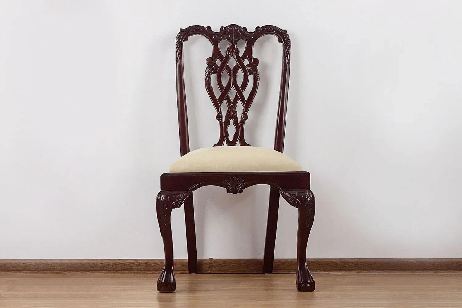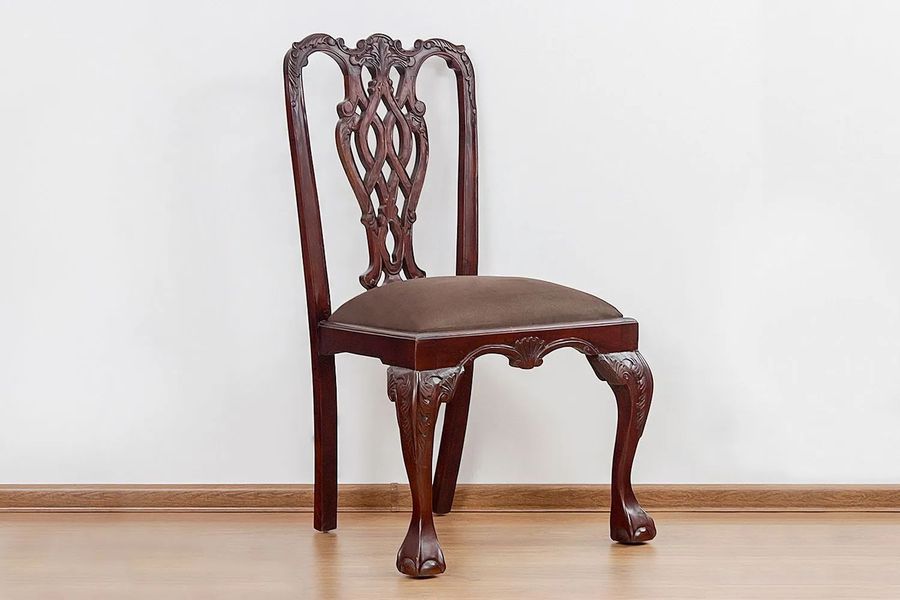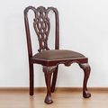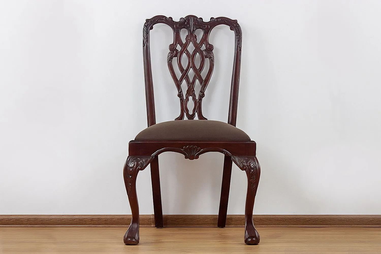 Antique Chippendale ribbon carving backrest dining chair replica made of mahogany solid wood. Pierced splat backrest curved top rail decorated elaborate wood carving. Brown suede fabric seat slip inside plain seat rail. Cabriole front legs and ball and claws feet, plain back legs curved backward.