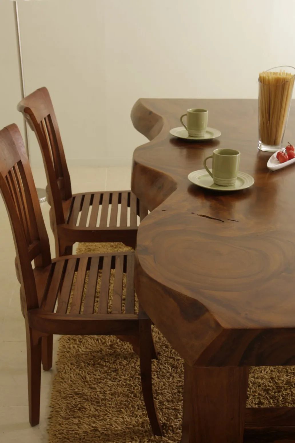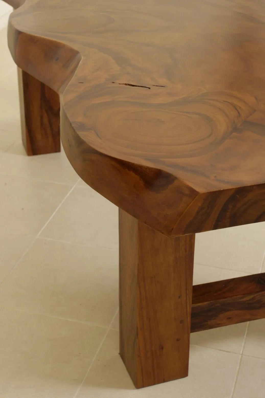 Sturdy and strong dining table employs a single block live edge top leaf bring a vigorous grandeur into your dining room. The table is made of rain-tree wood using a simple construction.