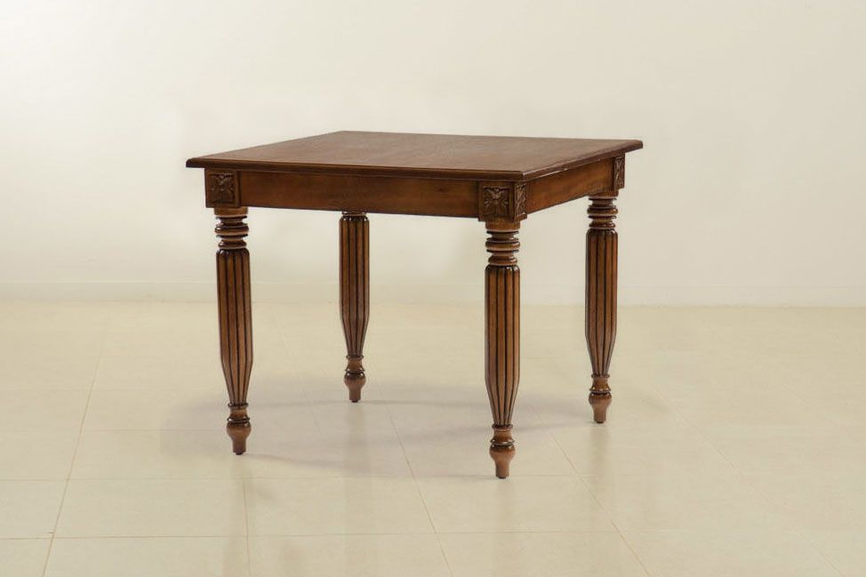 Comes with large reeds decoration on it turning legs the Raffles dining table square top will be a perfect dining table for four in a small kitchen. The table features smooth surface top leaf made of mahogany solid wood.