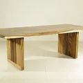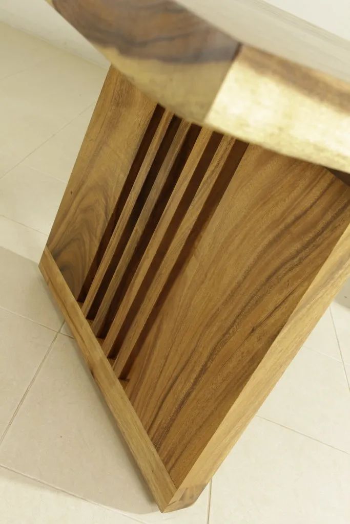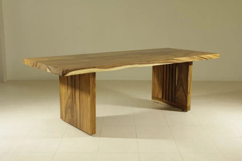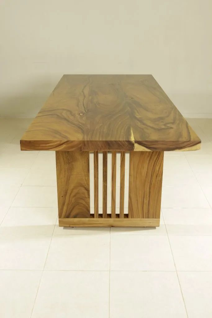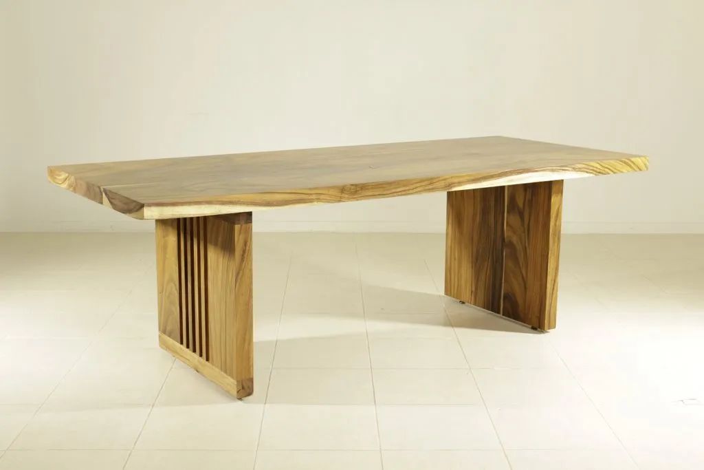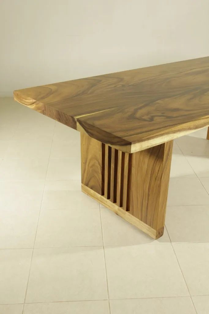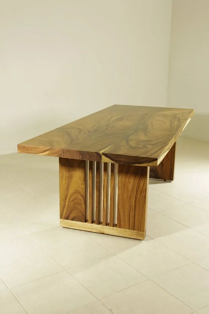 Sturdy and strong dining table employs a single block live edge top leaf bring a vigorous grandeur into your dining room. The table is made of rain-tree wood using a simple construction.