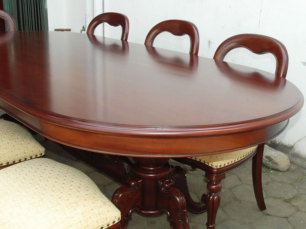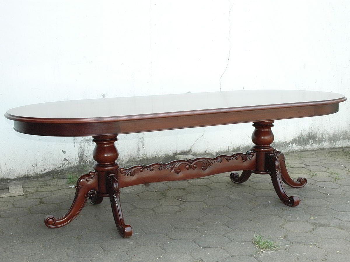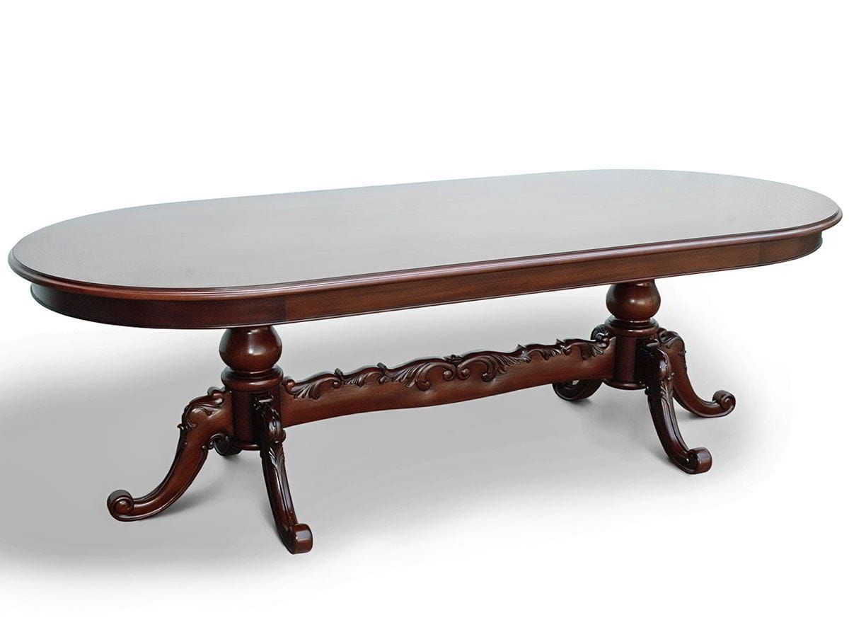 Our twin pedestal table is made of mahogany solid wood. Oval shape top leaf with profiled edge, fastened to the aprons using wooden clips to allow the movement of the solid wood while extracting and shrinking.