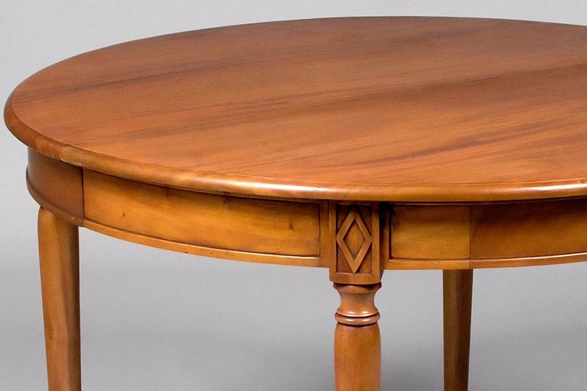 French classic period directoire dining table extendable from 120 to 170 using a leaf extension. The table handcrafted of mahogany wood, round top without extension changes to oval shape when using extension leaf. Four turning legs directoire bun feet.