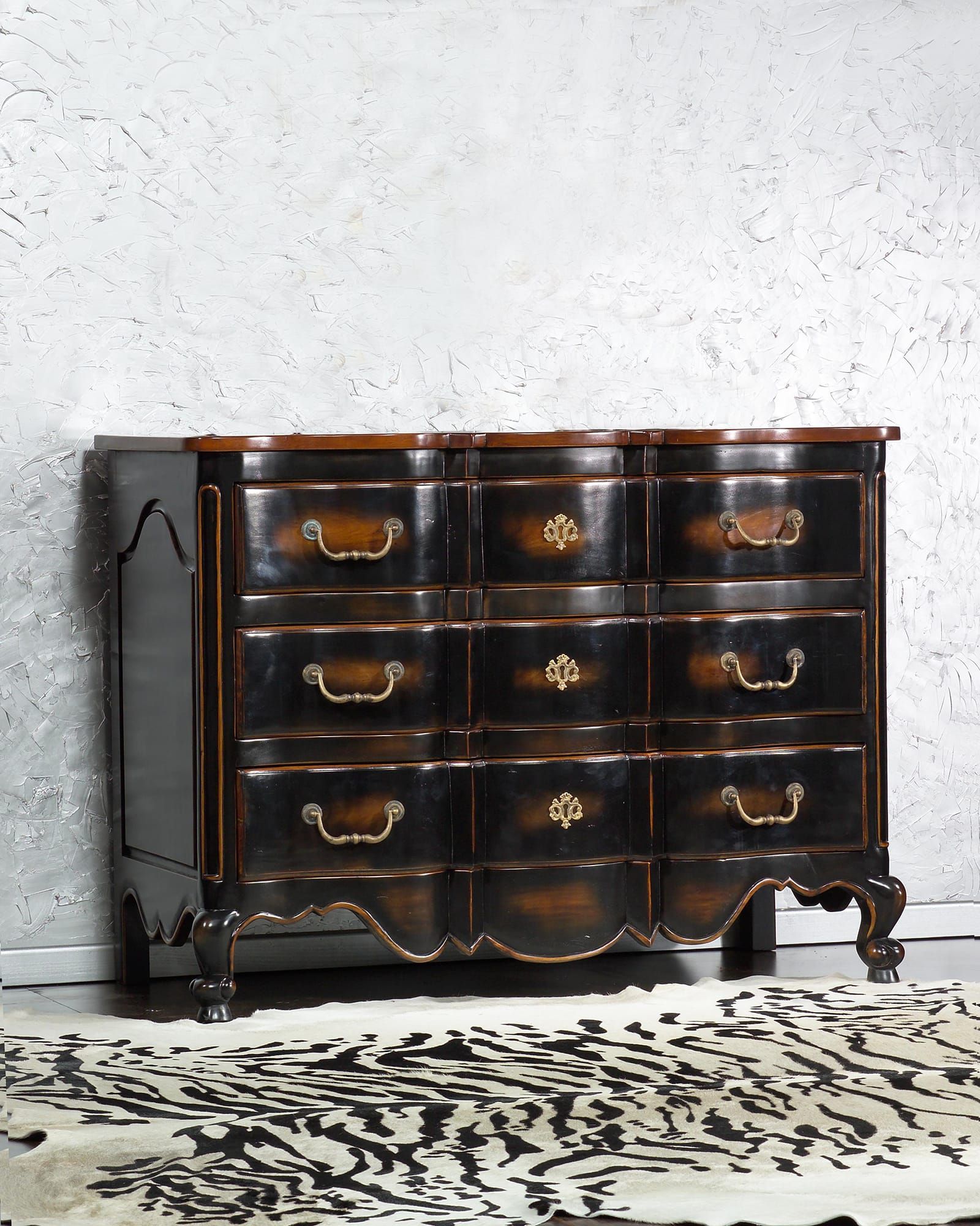 The wave front commode features curly bracket shape front side. Solid wood top leaf curves front edge similar to the drawer front shape, accented with small inlay on the center. 3 drawers with wooden runners, solid brass bracket pulls on the left and right, flower accent on the center.