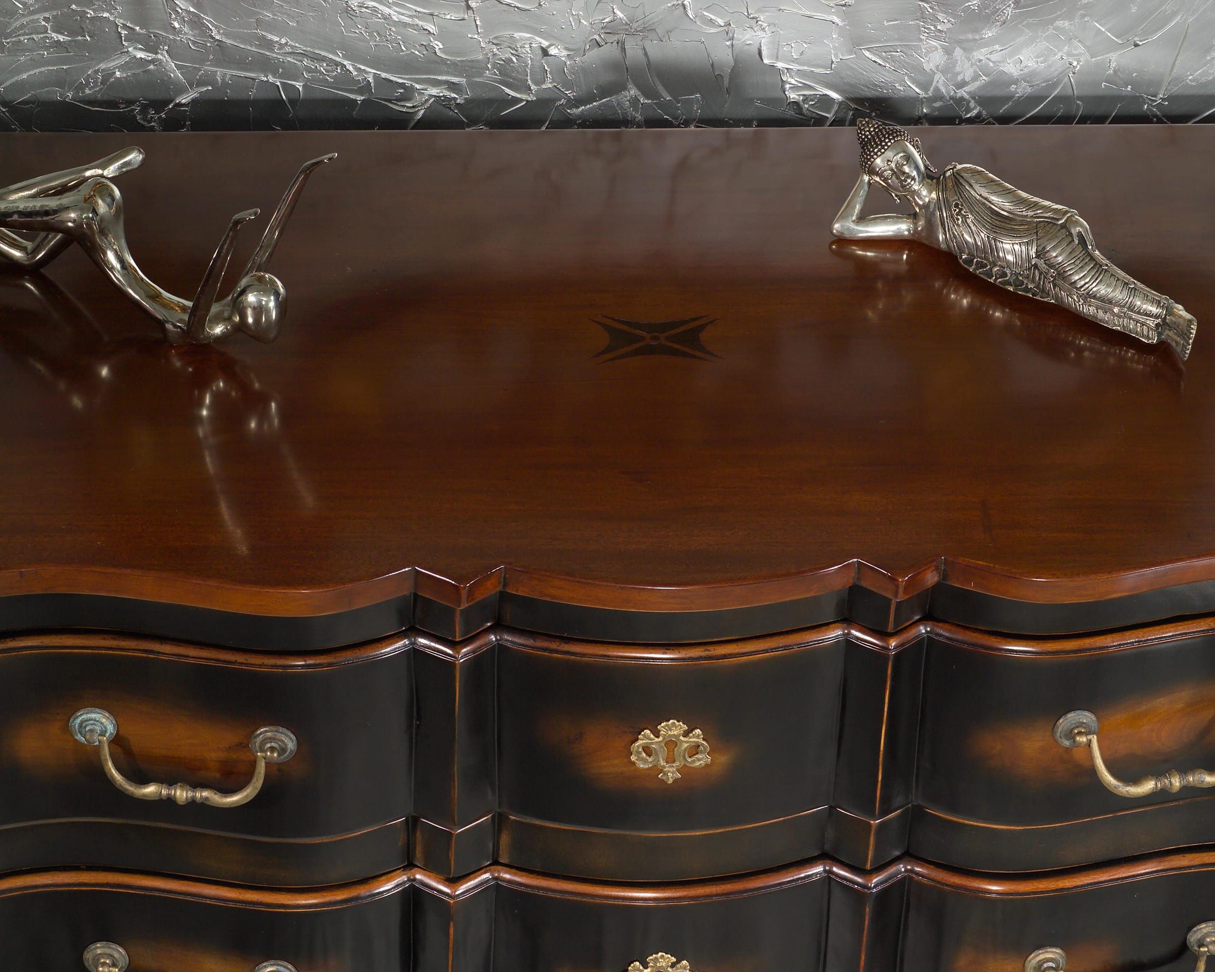 Victorian period dresser 3 drawers, curly bracket shape wavefront front, handmade of mahogany solid wood. Plain top leaf decorated with small inlay on the center, curves front edge similar to the front drawers shape.