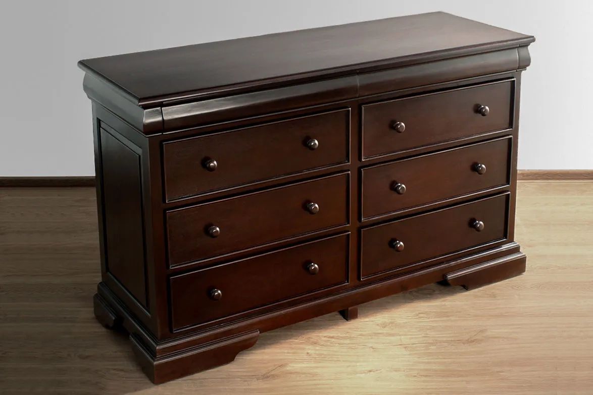 The sleigh dresser made with traditional solid wood furniture construction, tenon mortise frames joint and solid wood board raised panels at the left and right sides. Solid wood plain top leaf with rounded edges fixed on top of convex apron, the top leaf and it apron forming a sleigh front. Top most 2 small drawers have front shape similar to the apron, 6 large drawers in 4 rows with bead molding edges below. All drawers are made with dovetail joint and floating board base, using wooden runners and knob pulls to easing the pull out and push in.