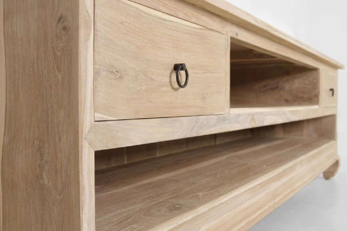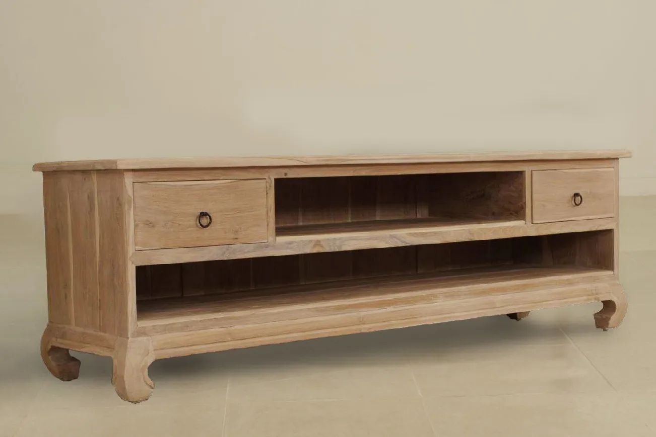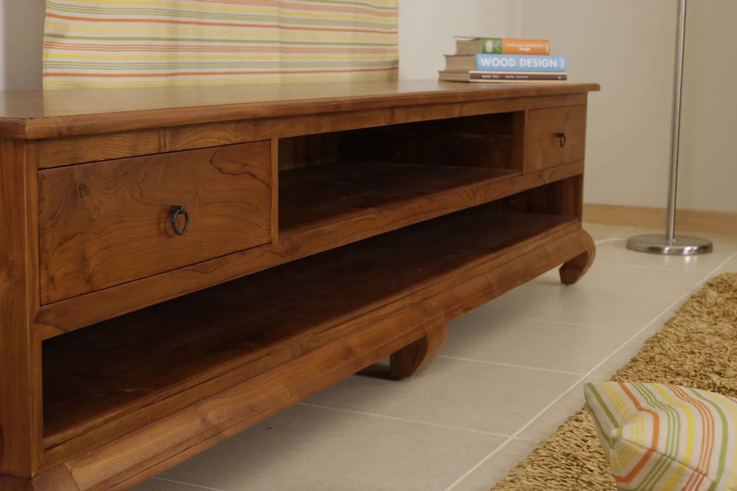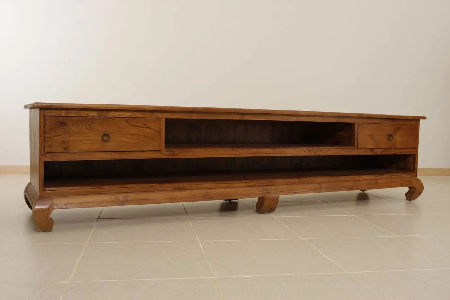 Oriental style low TV buffet handcrafted of teak solid wood. Two drawers and tow open shelves lying on top of convex legs and rails.