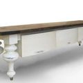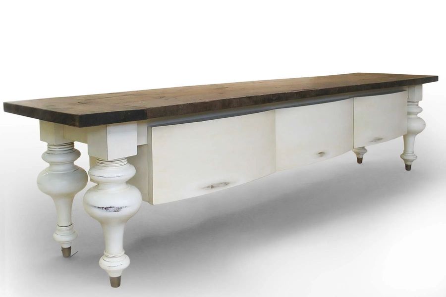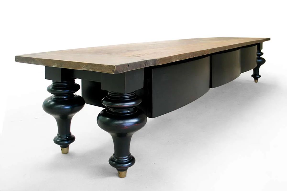 The reclaimed wood low console table is a perfect piece for a Tv stand in living room. Four large turned legs made of mahogany new wood and solid brass rounded feet, connected by plain aprons. 3 bow shape front drawers assembled with dovetail joint equipped with ball bearing runner hung under the aprons The legs, aprons, and drawer finished with black paint and poly urethane protective coat.