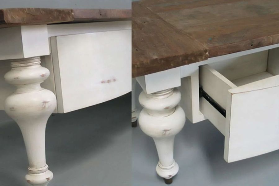 Contemporary coffee table 1 drawer natural distressed top leaf, black painted four legs and aprons.