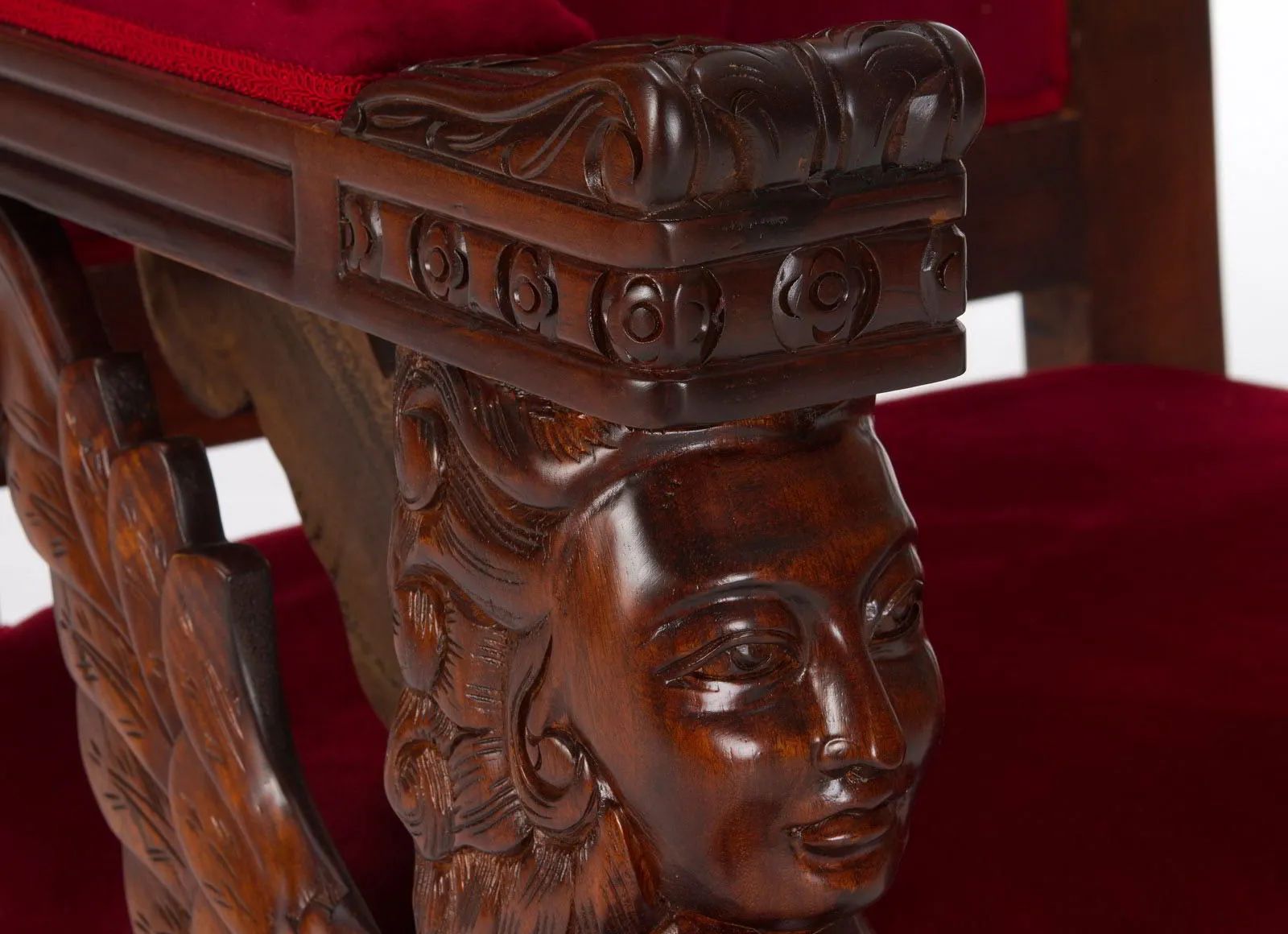 The stiles under the armrest decorated with angel head supporting the rail and spread wings functioned as corner brackets.