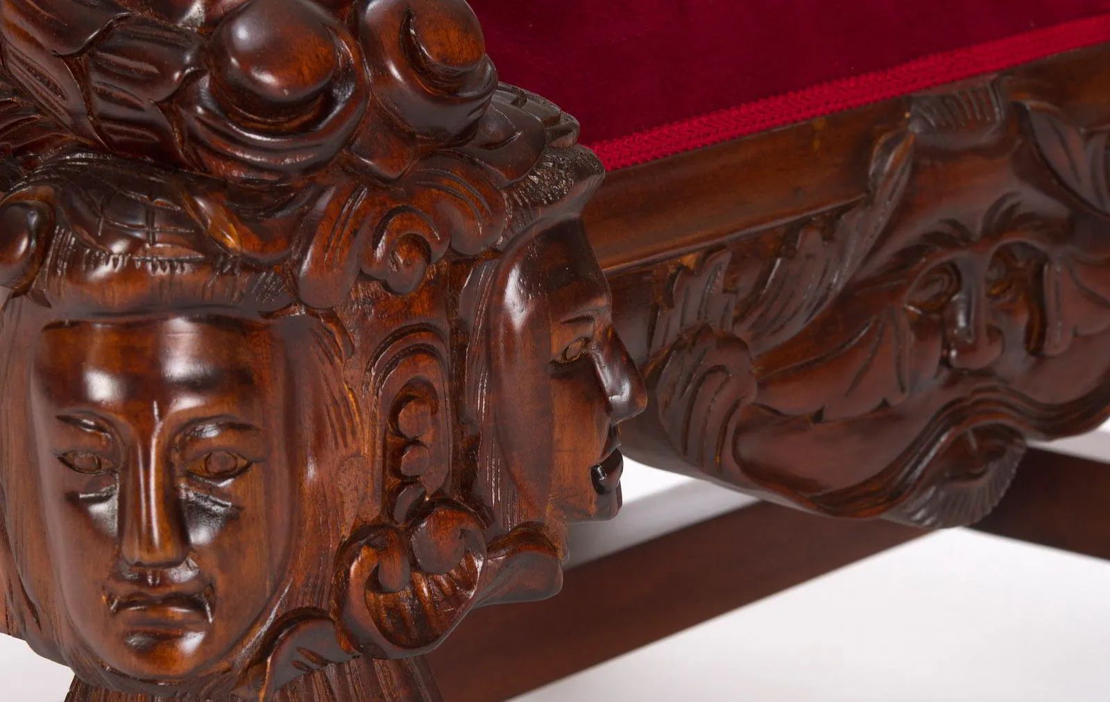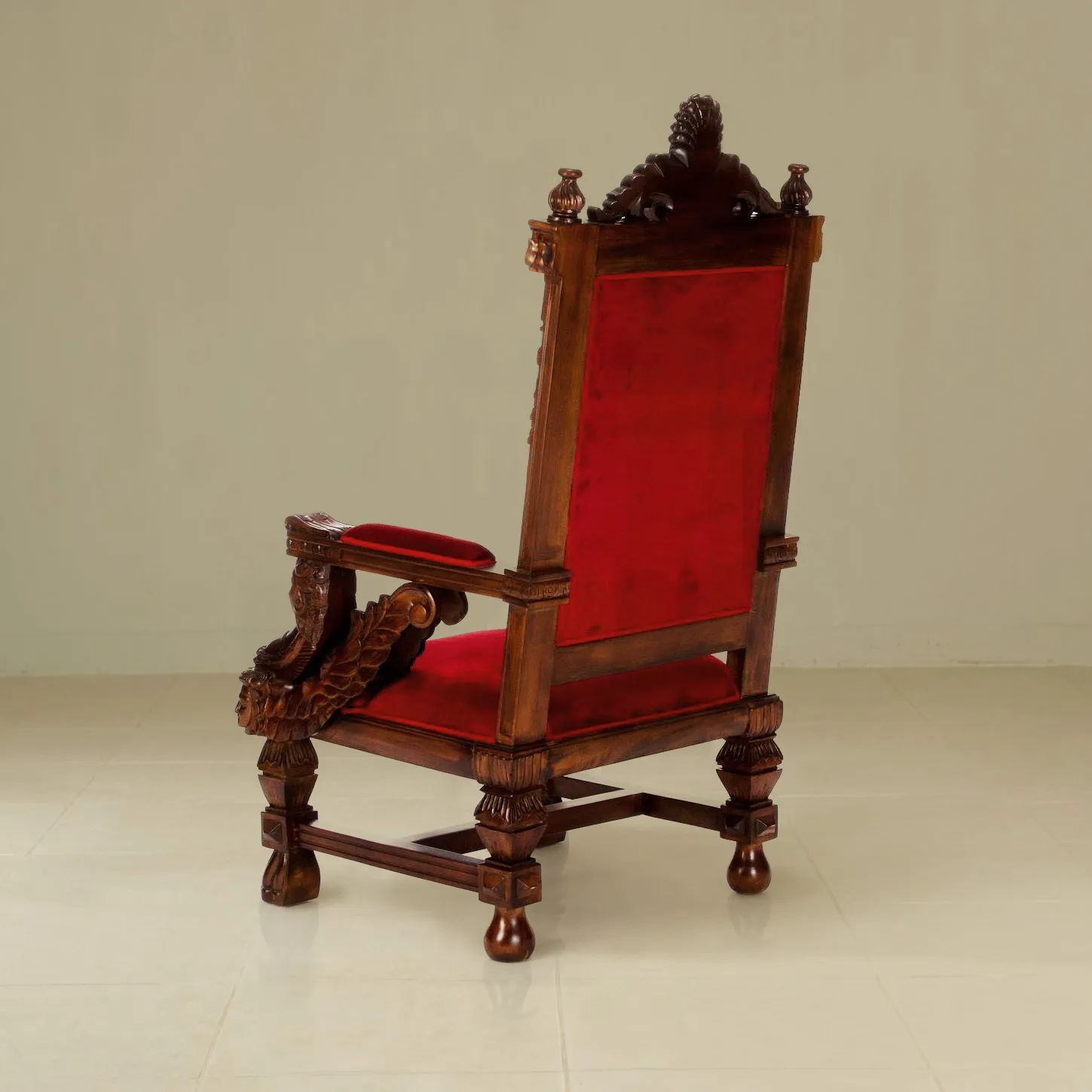The seat of the medieval chair is upholstered using high-density foam and dacron to provide comfort for the seat, covered with red velvet fabric.