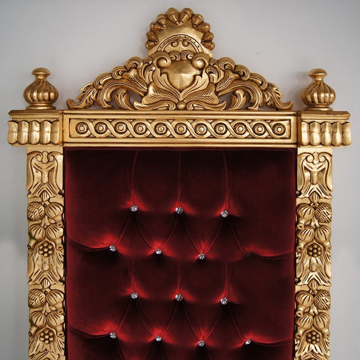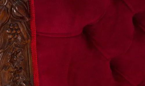 The medieval chair backrest stiles decorated with an elaborate wood carving of grapes, flowers, and leaves relief to symbolize prosperity. The medieval chair backrest upholstered using foam and covered with velvet, the backrest upholstery decorated with diamond-shaped tufting.