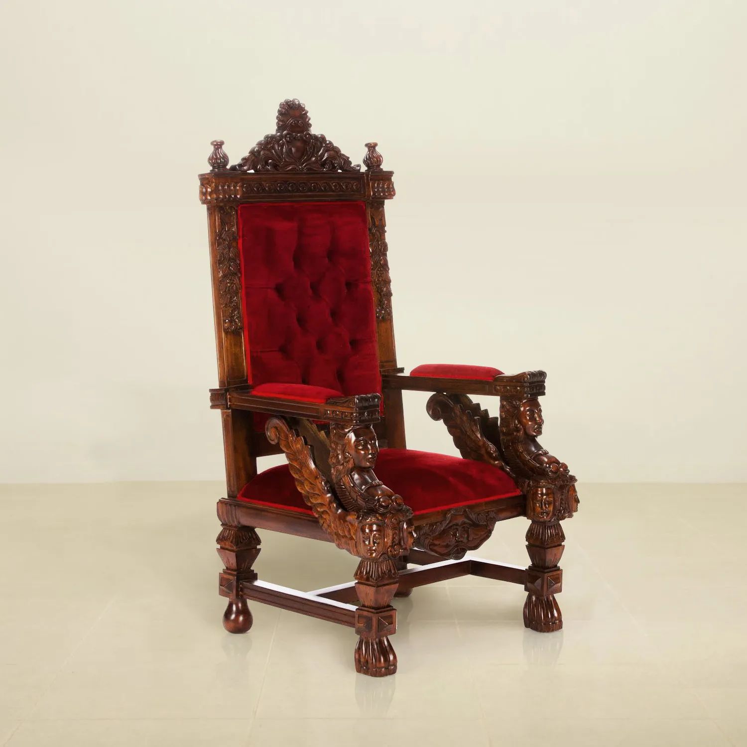 The medieval chair is handcrafted of mahogany wood, the chair features thick and strong frames, large and high in size. Decorated with elaborate carving foliage and angel faces, the medieval king chair can stand out as an eye-catching furniture piece in a large room.