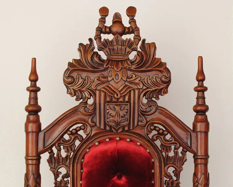 The medieval chair is handcrafted of mahogany wood, the chair features thick and strong frames, large and high in size. Decorated with elaborate carving foliage and angel faces, it will stand out as an eye-catching furniture piece.