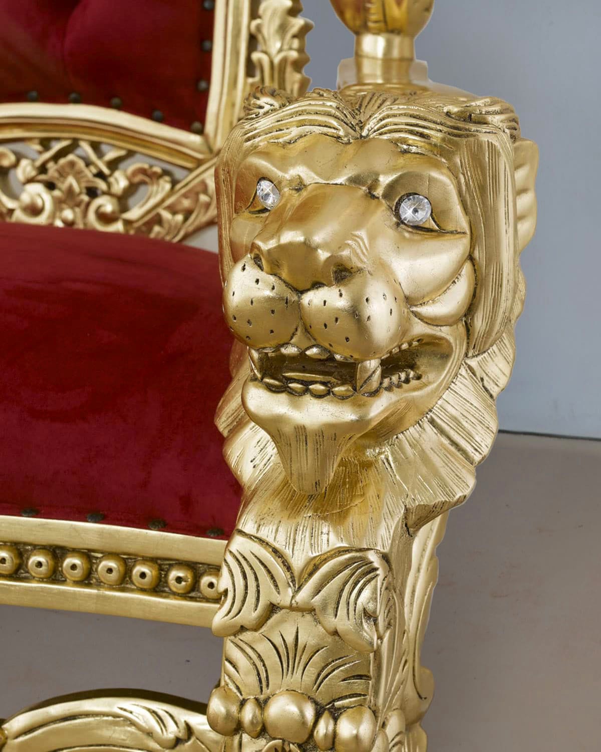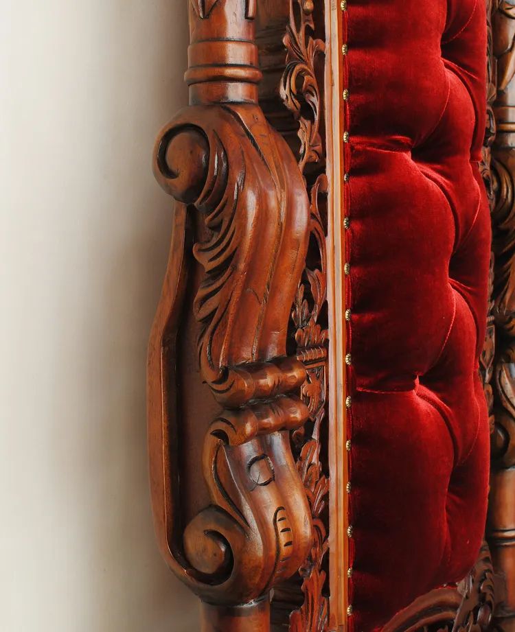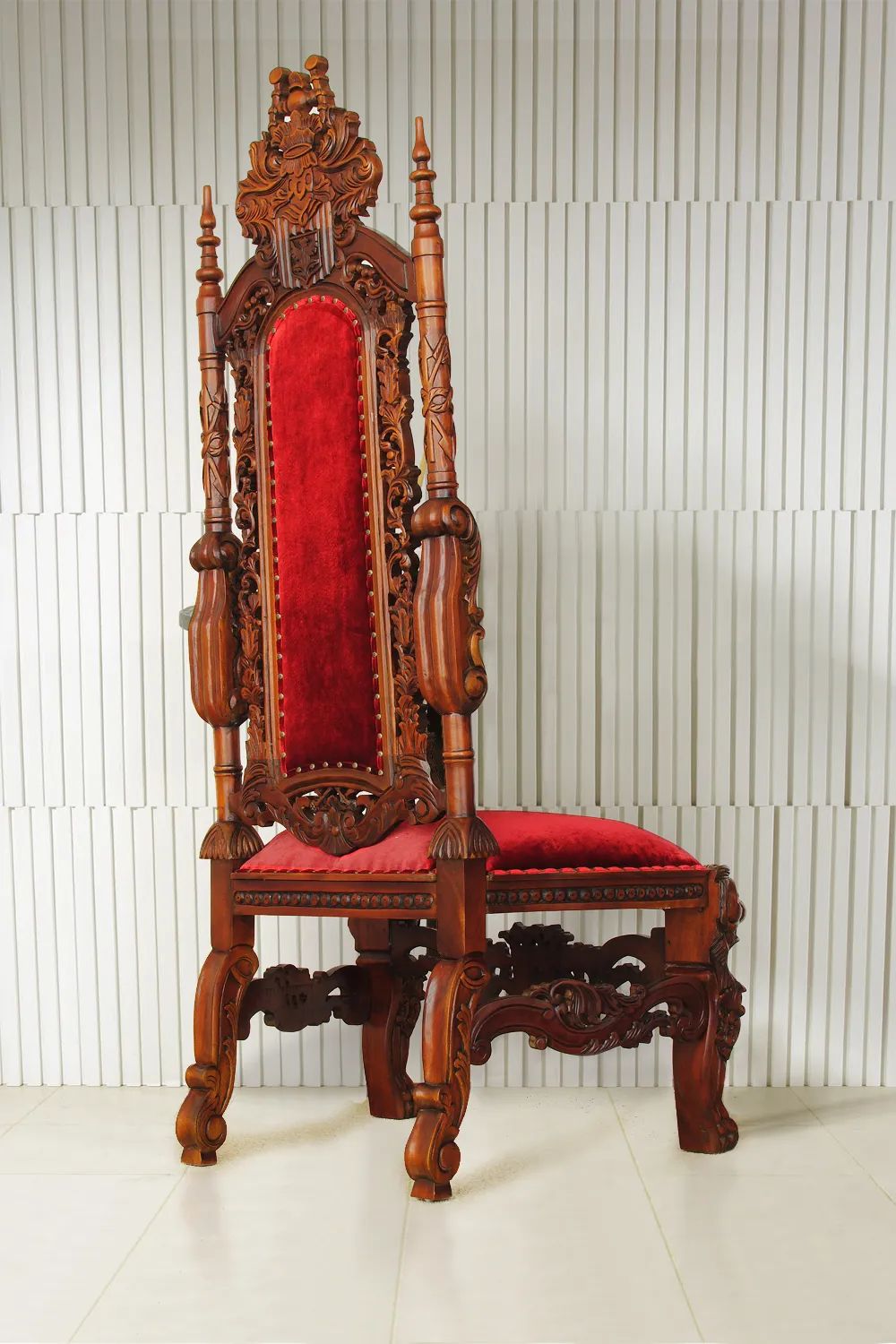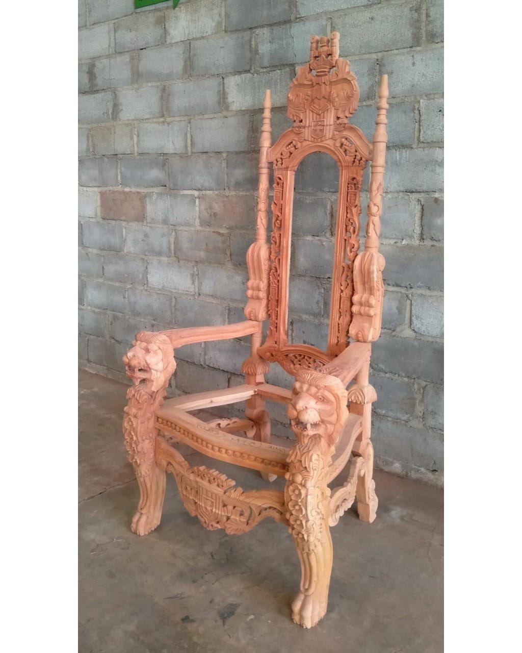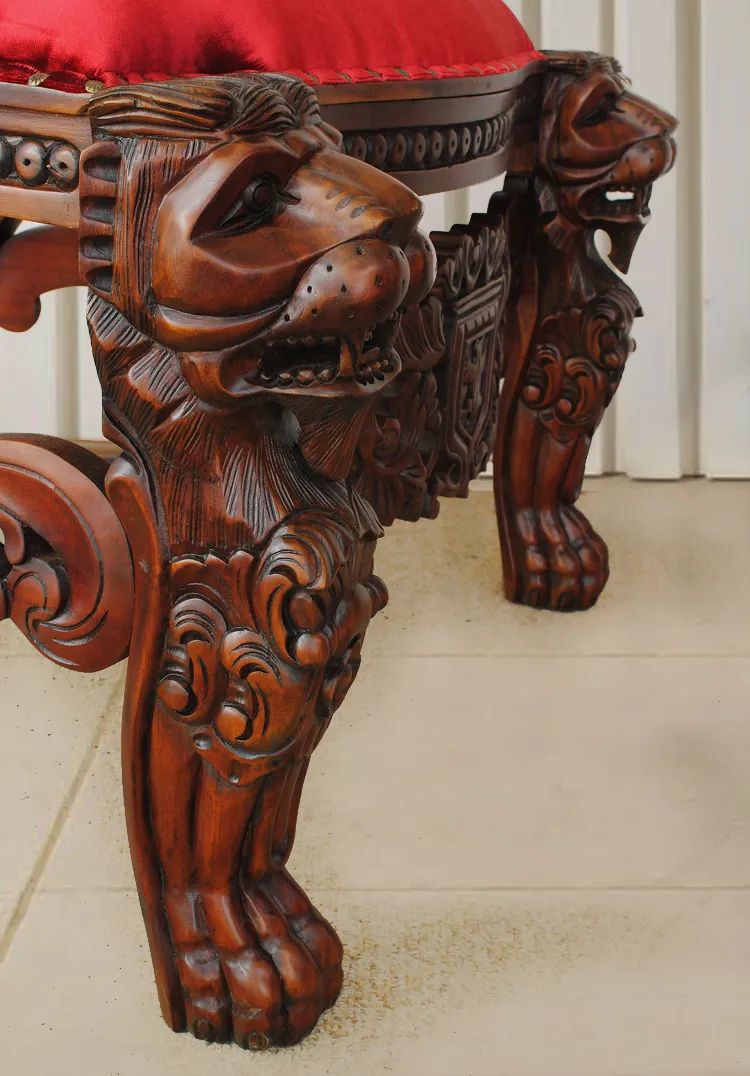 The king chair is a true copy of British regency lion carving chair, large size embellished with intricate carving and relief on the chair frames. Also known as Lord Raffles lion throne, the king chair has anything to become a statement-maker furniture in your house. A grandiose design piece in large size decorated with elaborate wood carving. The chair will stand out to become an eye-catching furniture piece in a room.
