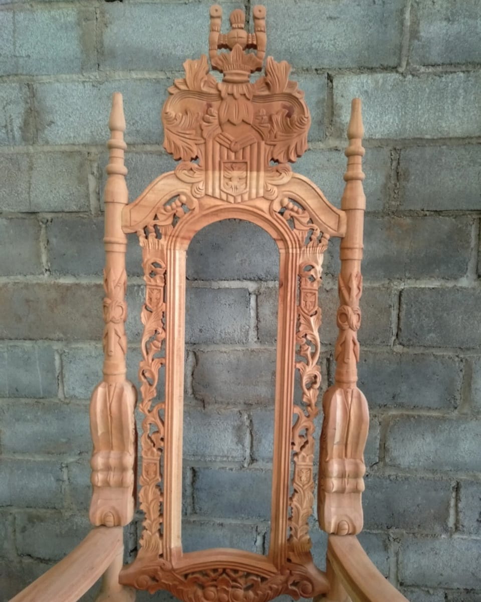 We made the chair look perfect from any sides, we pay attention even to the back side. The backrest frame and back side of the cresting also decorated with similar carving on the front side. The upholstered section also covered with the same fabric.