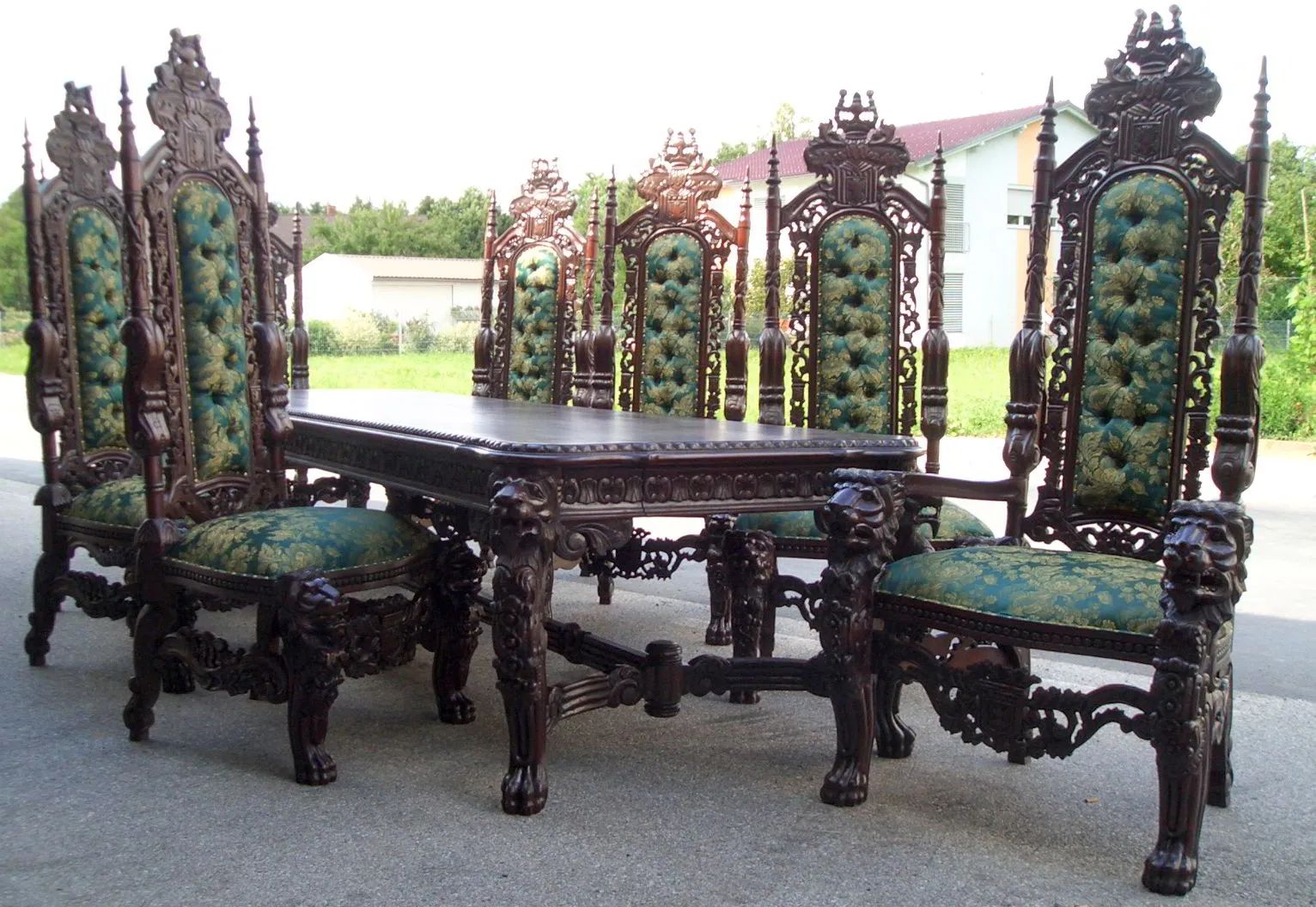 The king chair along with king side chair and dining table will also furnish a dining room into a dramatic view, a palace dining room. The thickness of the table top on large four lion head carving knee matching the chairs in a perfect theme.