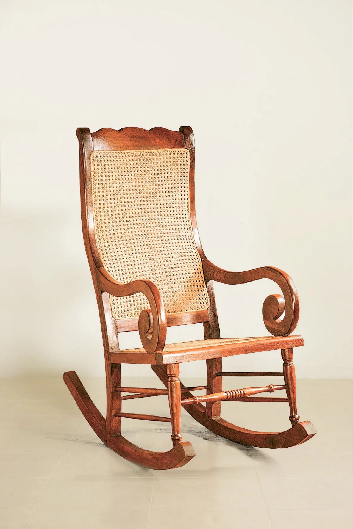 Scrolling arm rest regency period rocking chair, teak wood frame, rattan wicker seat and backrest. A comfortable chair on top of solid wood curved bands for gentle rocking motion backward and forward. The colonial period rocking chair is a perfect furniture piece in veranda for you to enjoy restful afternoon.
