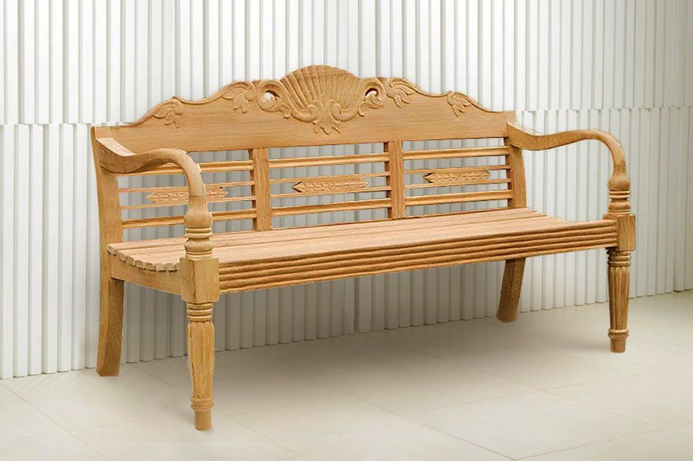 The Raffles garden bench is handcrafted of teak wood harvested from state-owned sustainable wood plantation in Java island. The bench backrest rail accented with peacock wood carving and chevrons.