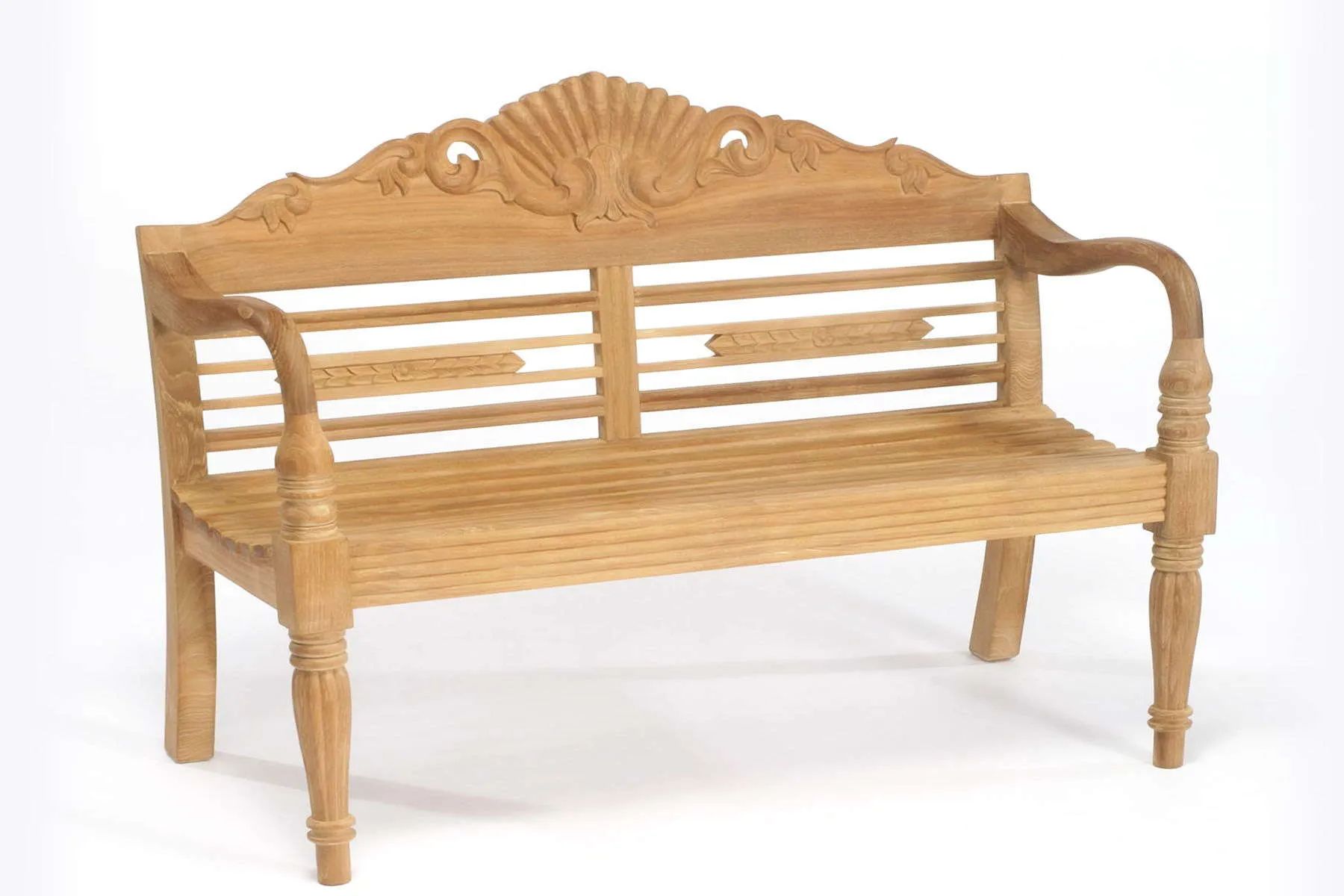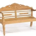 The Raffles garden bench will transform your patio into colonial period terrace. The bench features beautiful peacock carving on it backrest rail, curved arm rests and turning front legs decorated with vertical reeds and cylindrical rings.