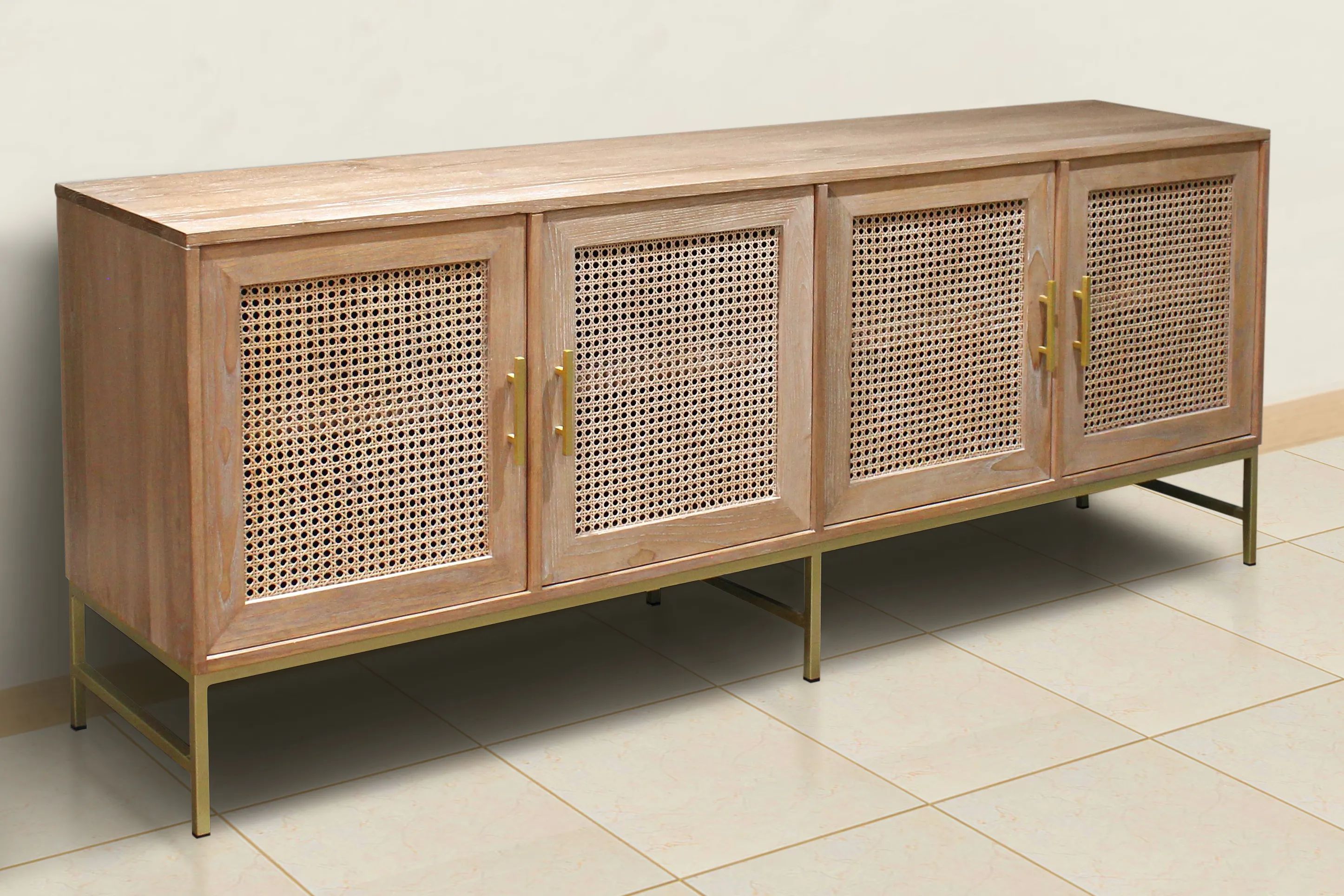 The vented buffet is a combination of hardwood and rattan on a steel base. The buffet body assembled of solid wood planks using traditional joinery that allowing solid wood movement, laying on a permanent welded aluminum legs.