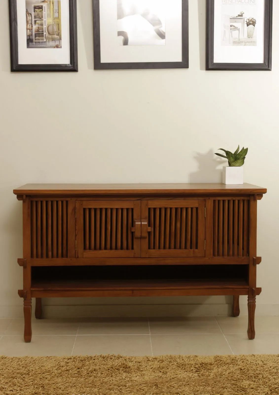 A colonial style furniture piece handmade of teak wood. 2 trellis door buffet 1 drawer top.
