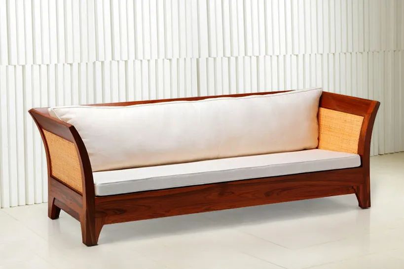 Living room 3 seats sofa solid wood slats sides and backrest beautifully curved outward. This best selling living room sofa is handmade of teak solid wood by our custom furniture builder. Thick and wide seat rails , yet comfortable with padded cushion backrest and seat.