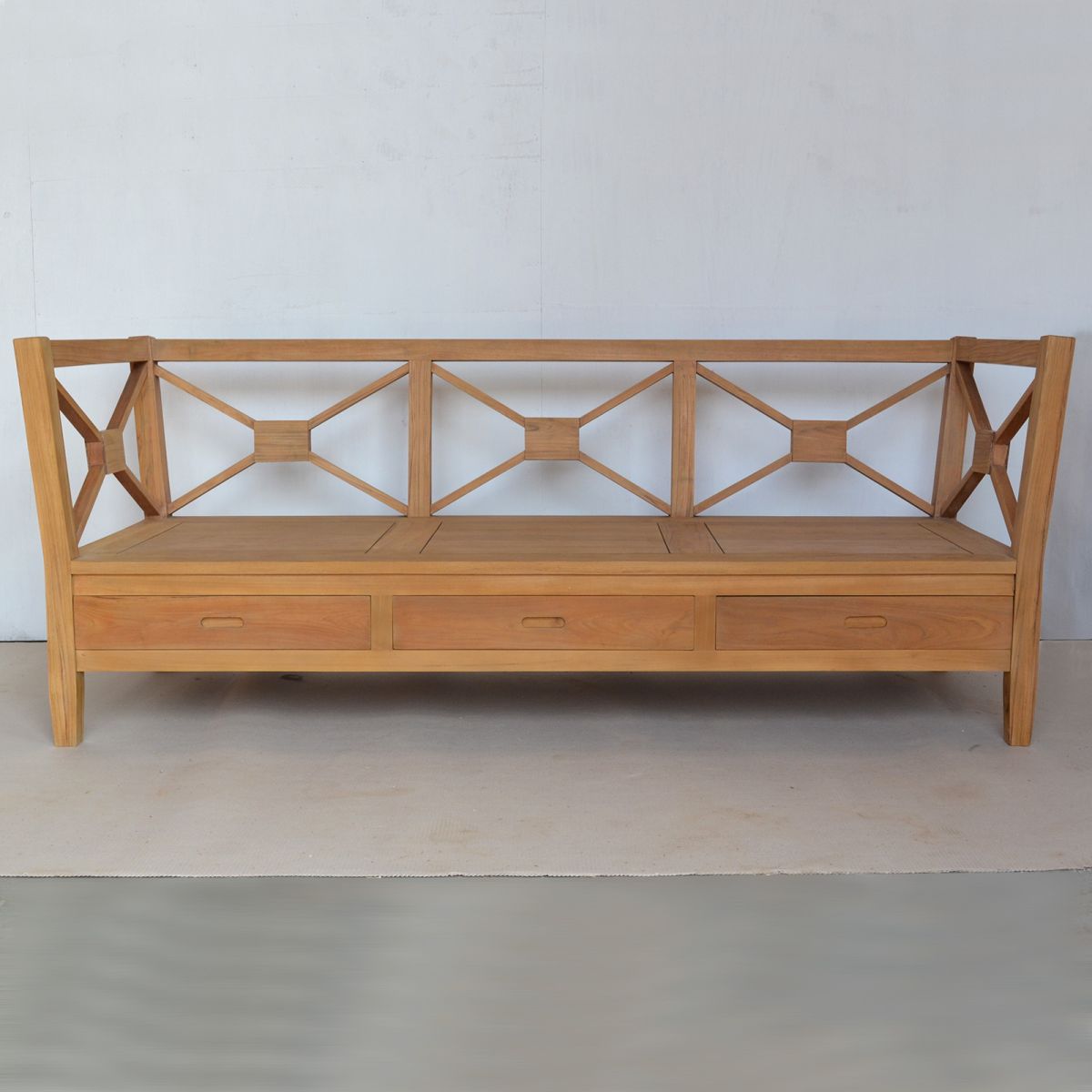 A simple backless bench with 3 drawers, cushion seat. Handmade of solid teak wood, rust drawers.