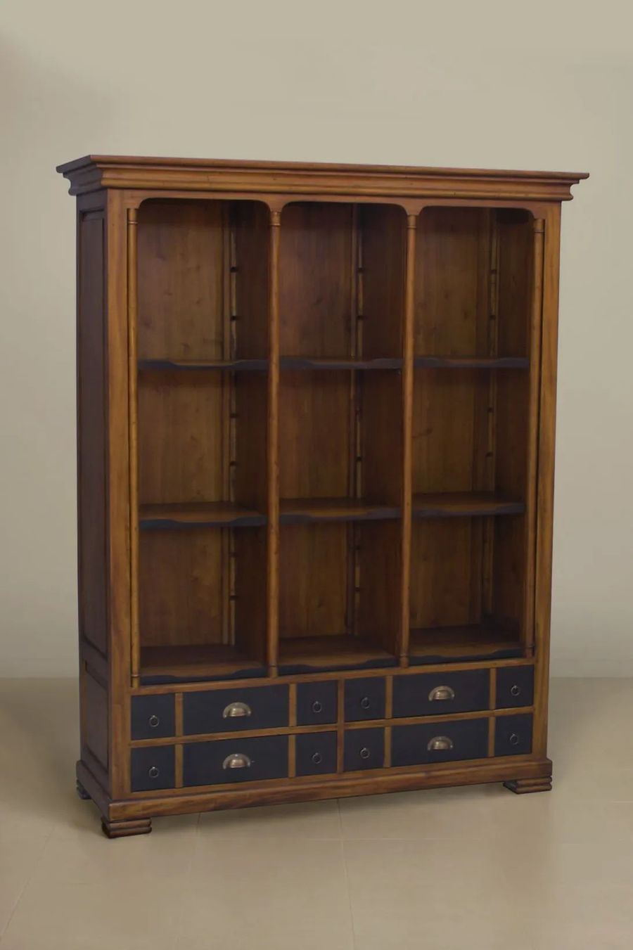 French Classic directoire bookshelf made of mahogany wood. 3 columns and 3 rows shelves, 4 large drawers, and 8 small drawers with solid brass pulls.